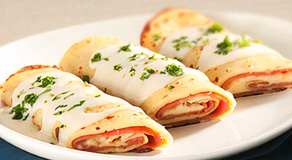 6) Panqueca de Espinafre com Peito de Peru Defumado e Molho de Limão