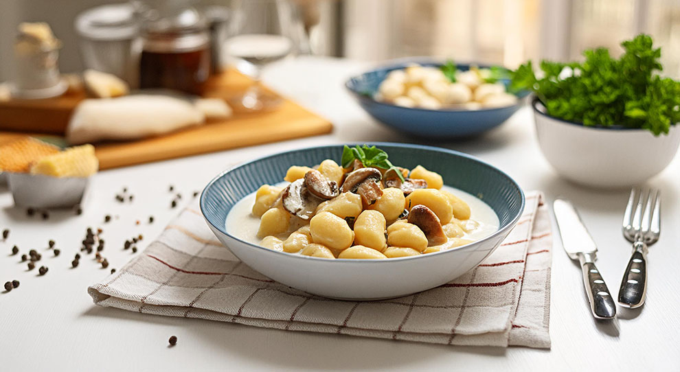 Descubra o segredo para um prato excepcional com o nhoque da sua marca preferida! Feito com ingredientes selecionados, nosso Gnocchi oferece uma textura macia e um sabor irresistível. Pense em pequenas almofadinhas de batata, cozidas na perfeição e prontas para absorver todo o sabor do nosso cremoso molho de cogumelos e ervas. Cada garfada é uma explosão de sabores que irá conquistar até os paladares mais exigentes.