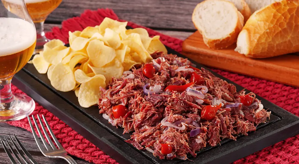 A carne seca acebolada com pimenta biquinho é uma versão deliciosa e inovadora do clássico petisco de boteco. A carne seca, bem temperada e desfiada, ganha um sabor irresistível com a combinação da cebola e o toque levemente picante da pimenta biquinho. Quando servida com chips de mandioca crocantes, o prato se torna ainda mais especial, pois a crocância dos chips complementa a suculência e o sabor da carne. Para fazer essa receita com mandioca, é importante fritar os chips de mandioca até ficarem dourados e crocantes. Essa receita é uma opção criativa e saborosa para quem quer surpreender os convidados com um petisco barato e criativo, mas cheio de sabor.